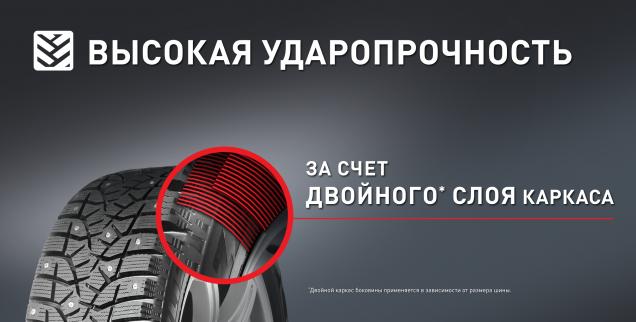 Два* слоя высокопрочного каркаса в боковине предотвращают повреждения и обеспечивают надежность при прохождении сложных участков дорог.